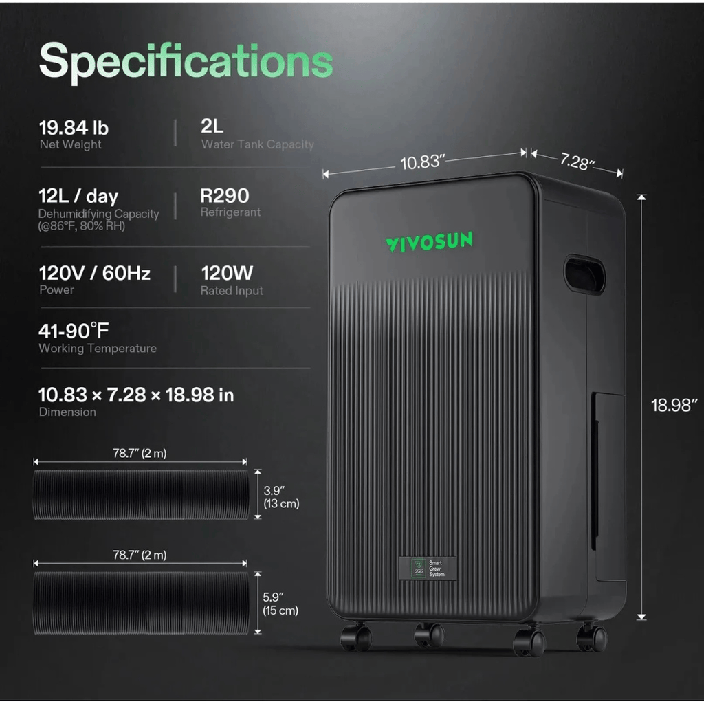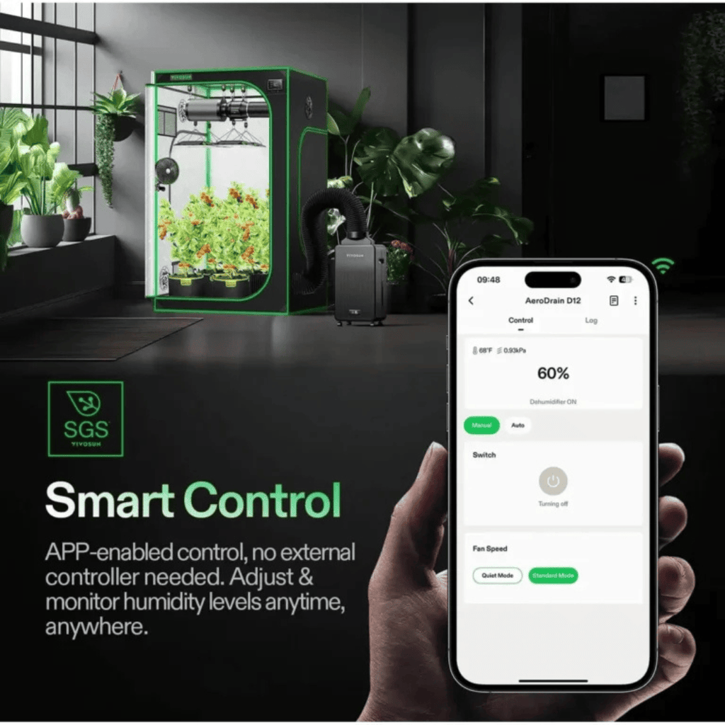 The VIVOSUN AeroDrain D12 is a smart dehumidifier built for grow tents and small indoor grow spaces. It helps prevent mold, stabilize VPD, and reduce humidity spikes during flowering, drying, or lights-off periods. It works well in tents up to 5×5 ft or smaller, but avoid over-drying in compact setups.